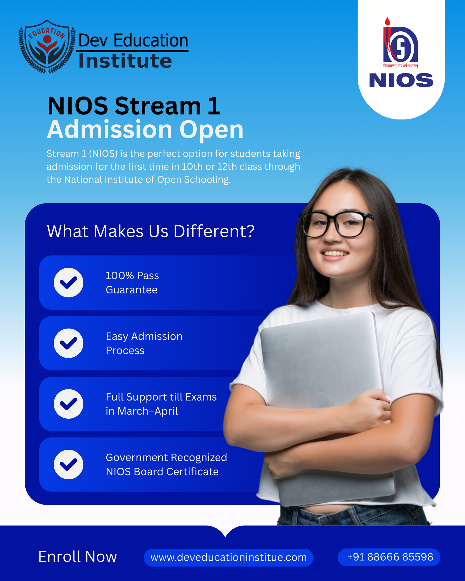 At Dev Education Institute, we provide complete guidance and support for NIOS Stream 1 March–April Admission for 10th and 12th students. Our expert team helps you with NIOS registration, online form filling, subject selection, and document verification to ensure a smooth admission process. We offer detailed information about the NIOS syllabus, TMA (Tutor Marked Assignments), and exam preparation to help students achieve better results. With personalized counseling, we make the NIOS admission process simple and error-free. Whether you are a school dropout, working professional, or want to complete your studies, we assist you in every step of your NIOS enrollment. Join Dev Education Institute for trusted NIOS open school admission services and secure your academic future with confidence.
